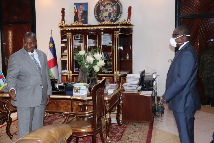 En visite de travail en terre centrafricaine, Monsieur Jean-Claude Mabenze est venu échanger avec le Chef de l’Etat centrafricain sur les mesures conjointes de prévention à prendre contre le Coronavirus en République Centrafricaine et en République sœur du Congo Démocratique.