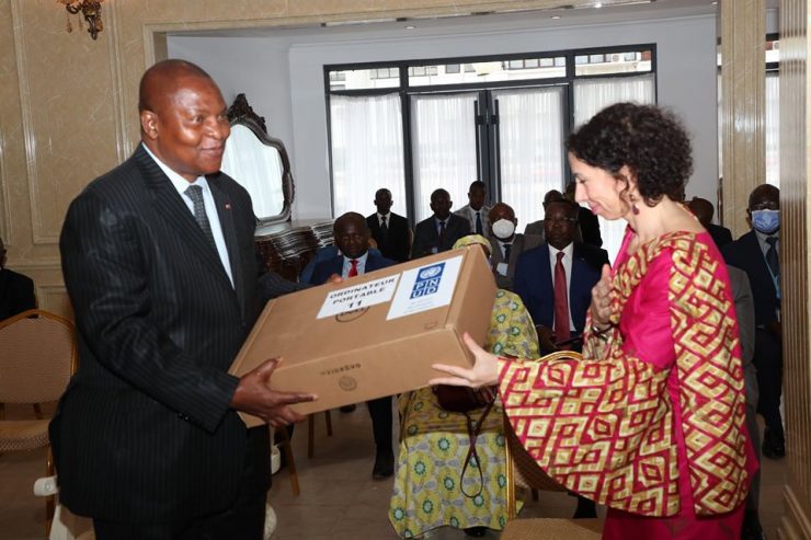 C’est le Président de la République, Son Excellence Pr Faustin Archange TOUADERA qui a réceptionné ces kits informatiques des mains de la Représentante résidente du PNUD en Centrafrique, Mme Nathalie BOUCLY en présence du Premier Ministre Firmin NGREBADA.