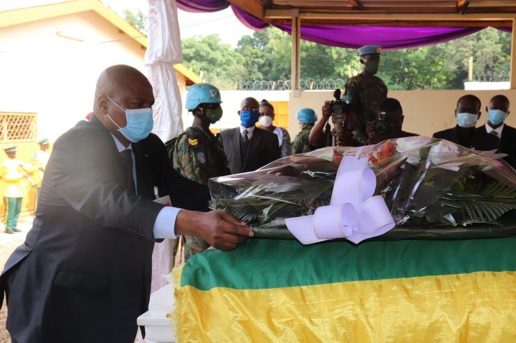 Pour témoigner de la reconnaissance du peuple centrafricain, le Président de la République a d’abord déposé une gerbe de fleurs sur la dépouille avant de lui décerner à titre posthume le ‘’Témoignage de Satisfaction’’ pour les éminents et loyaux services rendus à la nation.
